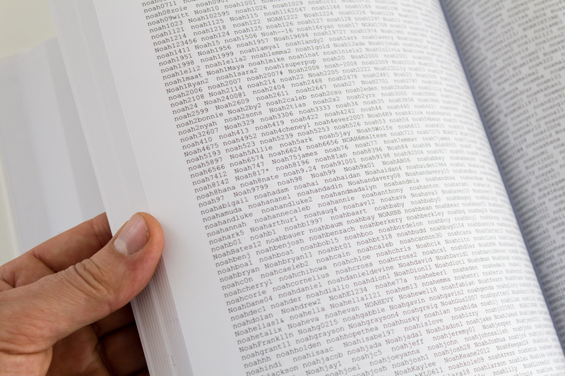 Forgot Your Password is a set of eight books containing some 4.7 million passwords that were leaked in June 2012. Visitors to the exhibit, which has toured Europe and is currently residing in [artist Aram] Bartholl’s native Germany, are invited to look through the volumes to see if their password is inside. Each password is arranged alphabetically and presented without its linked username(s).