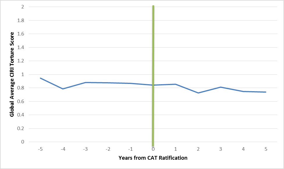 The line shows the average torture score for countries during the five years leading up to ratification and the five years following ratification (where 0 refers to frequent torture and 2 refers to no torture). If the average country had reduced torture during this period, then the line would have sloped up.
