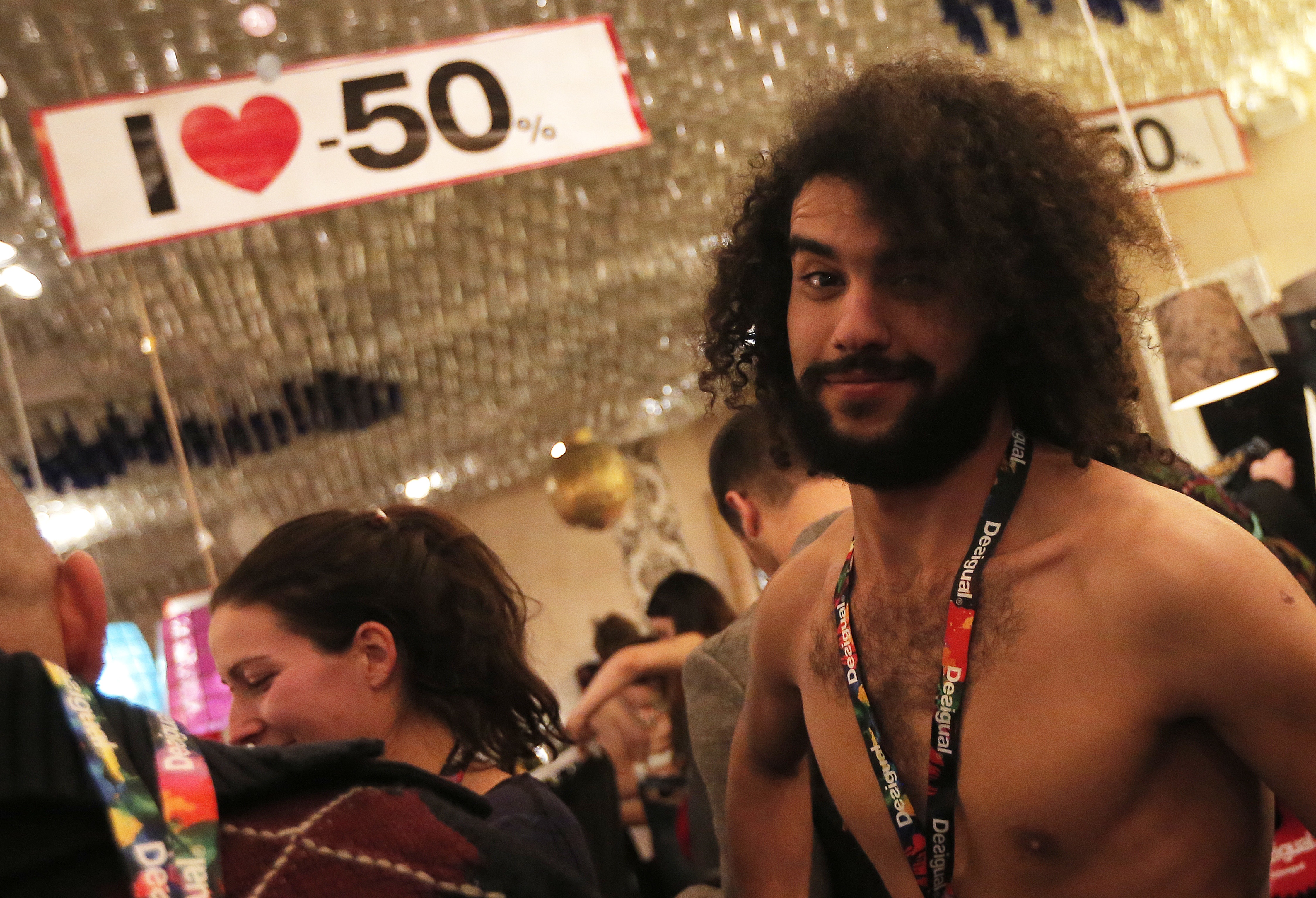 A man stand in his underwear in a Desigual fashion store as part of the ‘Semi naked party” offer at ‘Le Gru Store’ in Grugliasco, near Turin, on January 4, 2014. The event, marking the start of the winter sale season in Italy, offers the first 100 participants one free top and bottom as long as they come to the store dressed only in undergarments. By Marco Bertorello/AFP/Getty Images.