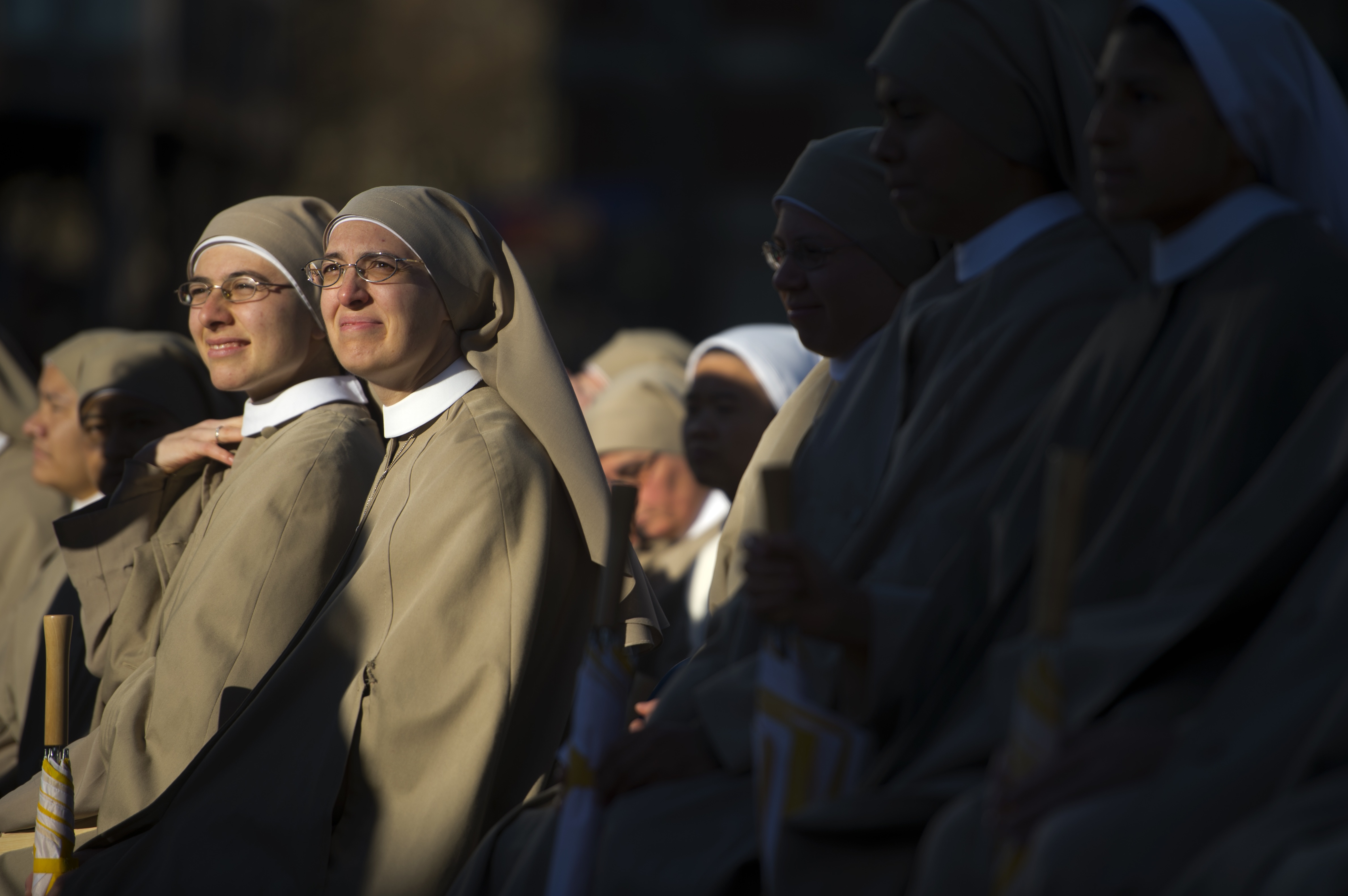Nuns attend the mass for the Holy Family in Madrid on December 29, 2013. Tens of thousands of believers poured into central Madrid to celebrate an open-air Roman Catholic mass for the Holy Family just days after the Spanish government agreed to tighten the abortion law. By Pierre-Philippe Marcou/AFP/Getty Images.
