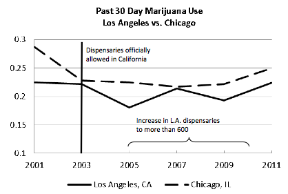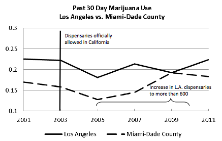 Miami caught up in 2009, but then faded. Los Angeles, more to the point, barely has any more marijuana use in 2011 than in 2001. This is from the Mark Anderson study I referred to earlier today.