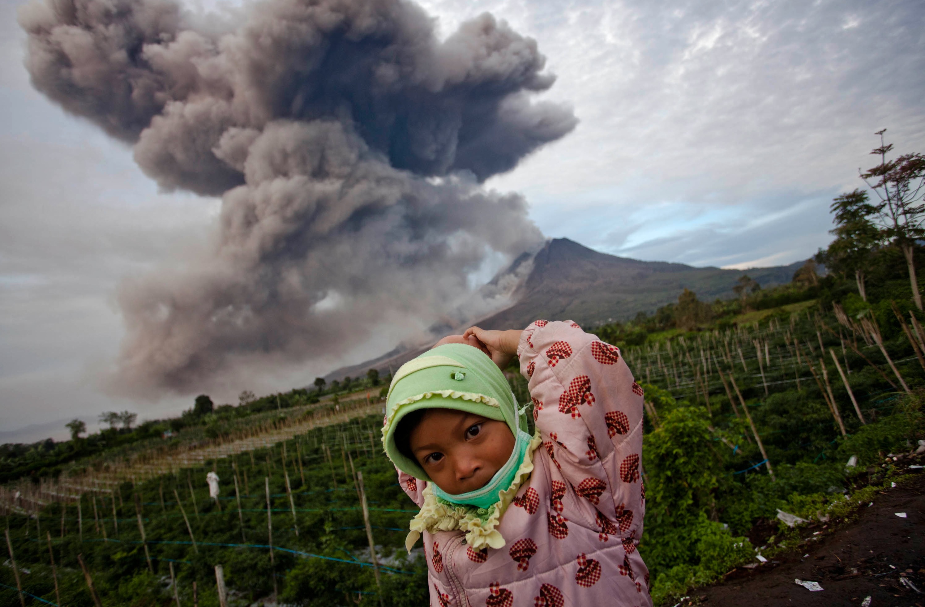 A girl stands in the foreground as Mount Sinabung spews pyroclastic smoke in Karo District, North Sumatra, Indonesia on January 8, 2014. The number of displaced people has increased to 22,000 in Western Indonesia as Mount Sinabung continues to spew ash and smoke after several eruptions since September. Eleven deaths have now been recorded as a result of the eruptions, with hundreds more falling ill. By Ulet Ifansasti/Getty Images.