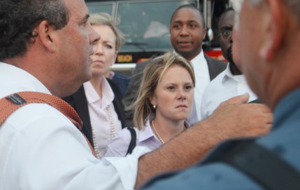 SEASIDE HEIGHTS, NJ – SEPTEMBER 8: New Jersey Governor Chris Christie (L) and Deputy Chief of Staff Bridget Anne Kelly (C) stand at the scene of a boardwalk fire September 12, 2013 in Seaside Heights, New Jersey. According to reports January 8, 2014, Christie Deputy Chief of Staff Bridget Anne Kelly is accused of giving a signal to the Port Authority of New York and New Jersey about two weeks before two lanes of the George Washington Bridge, allegedly as punishment for the Fort Lee, New Jersey mayor not endorsing the Governor during the election. (Photo by Phil Stilton/Getty Images)
