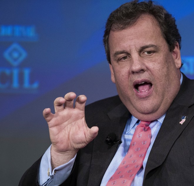 New Jersey Governor Chris Christie is interviewed by Gerard Baker (out of frame), Editor-in-Chief, Dow, Jones & Company, and Managing Editor, The Wall Street Journal, at The Wall Street Journal CEO Council, November 18, 2013 at the Four Seasons Hotel in Washington, DC. The Wall Street Journal CEO Council annual meeting brings together the worlds most powerful chief executives to address the most pressing public policy and business issues of the day. AFP Photo/Paul J. Richards (Photo credit should read PAUL J. RICHARDS/AFP/Getty Images)
