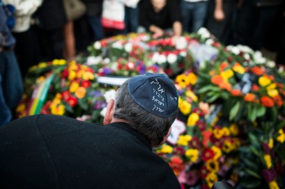 HAVAT HASHIKMIM, ISRAEL – JANUARY 13: A mourner wearing a yarmulke, reading ‘Ariel Sharon Hero of Israel’ pays his last respects at the grave of Israel’s former Prime Minister Ariel Sharon during the funeral at Havat Hashikmim on January 13, 2014 in Israel. Former PM Ariel Sharon’s died on Saturday aged 85 in Tel Hashomer hospital near Tel Aviv and had been in a coma since January 4, 2006. (Photo by Ilia Yefimovich/Getty Images)