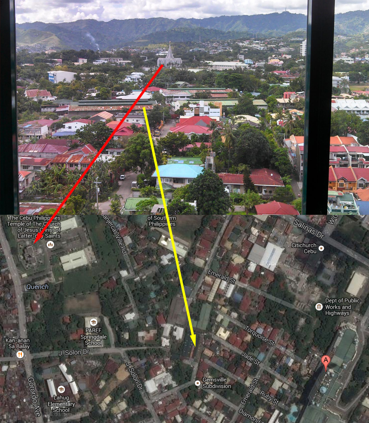 The last time the VFYW contest was in the Philippines (VFYW #153), it was an absolutely brutal challenge to find the right spot. But this one was far easier, thanks mostly to the Mormon temple sitting smack dab in the middle of the frame. This week’s view comes from Cebu City. The picture was taken from the Waterfront Cebu City Hotel and Casino from, let’s say, the 12th floor. The view looks west north west along a heading of 296.5 degrees. A marked overhead view and a pic of the possible window are attached: