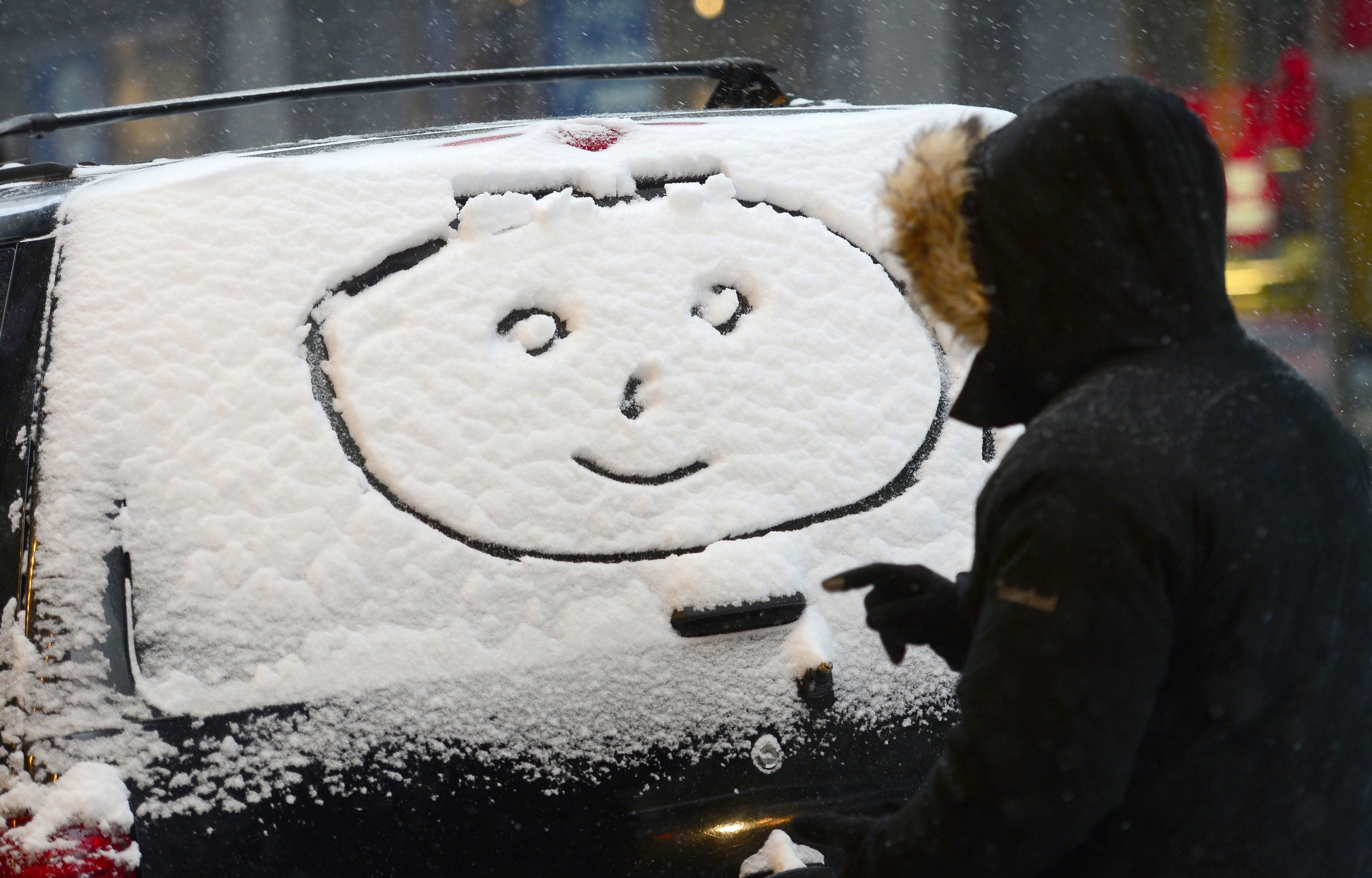 A person makes a happy face on a car window during a snow storm in New York City on January 21, 2014. In New York, a storm alert was issue for noon (1700 GMT) Tuesday to 6:00 am (1100 GMT) Wednesday with as much as a foot (30 centimeters) forecast for the metropolitan region. By Emmanuel Dunand/AFP/Getty Images.