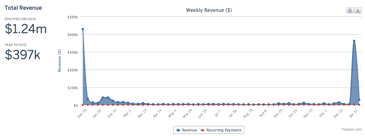 Those peaks tell it all. Since January 1 this year, we have raised almost $400K. On the one hand, that’s a long way from our total revenues of nearly $900K in 2013. On the other, we’re only three weeks in. Since subscriptions don’t actually expire for two more weeks, and since subscribers will still have their free read-ons for a while after that, we won’t really know till the end of March how the year is going to shake out. If we stall now, we’ll be in deep trouble. If you keep renewing, we’ll survive and even thrive. Whether this model works is entirely up to you at this point.