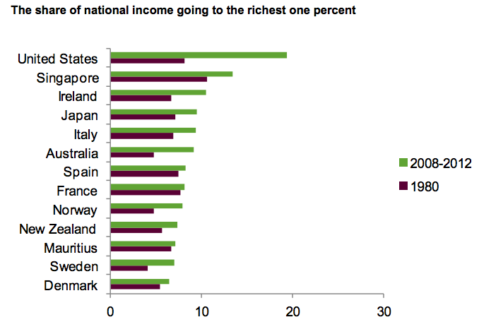 If there’s one kernel of hope—not mentioned in the Oxfam report, as far as I can tell—it’s that inequality between countries may be easing slightly (though it’s hard to tell for sure). On a country-by-country basis, though, the filthy rich have only been getting richer. Between 1980 and 2012, the wealthiest 1 percent increased their share of the spoils in 24 of the 26 countries Oxfam surveyed. This includes the United States, where the wealthiest 1 percent have captured 95 percent of all economic growth since the financial crisis of 2009, while the bottom 90 percent have gotten poorer.