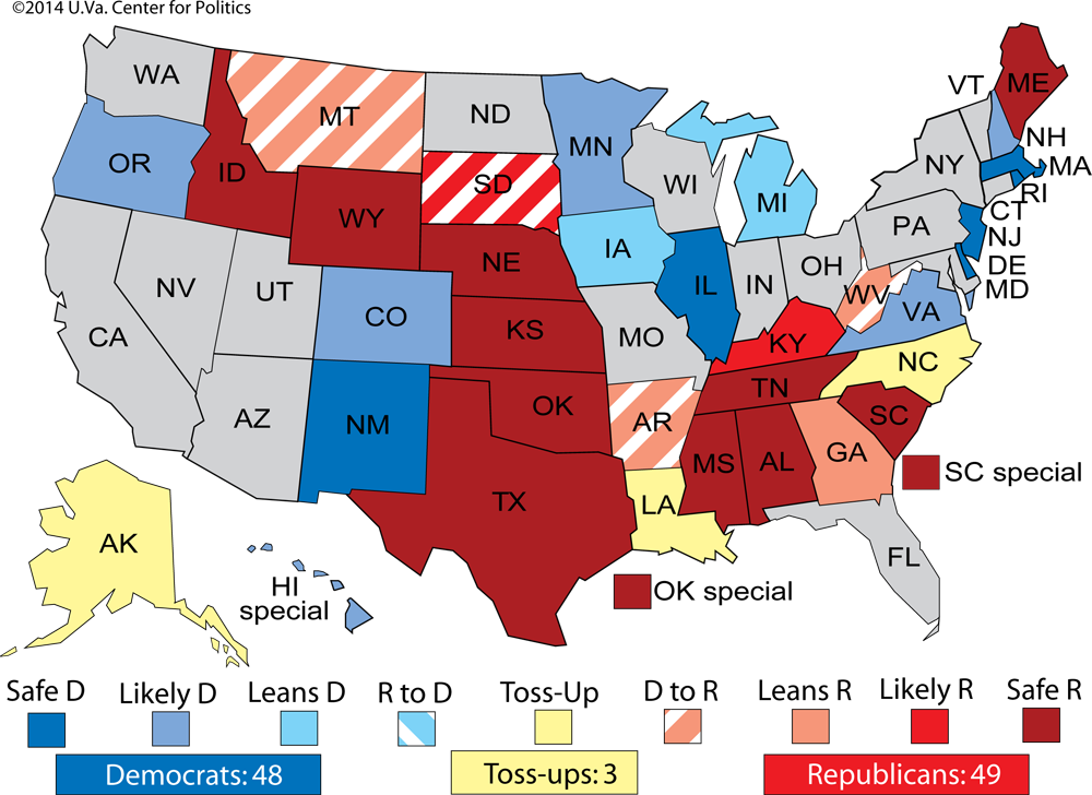 We now favor Republicans in four Democratic-held seats: Montana, South Dakota and West Virginia, as well as — in a ratings change — Arkansas, where Sen. Mark Pryor (D) appears to be at least a slight underdog to Rep. Tom Cotton (R) in a reddening state. Assuming Republicans can win those, they have roughly even odds to win in three other states where there are Democratic incumbents: Alaska, which we’ve long classified as a Toss-up, and Louisiana and North Carolina, which we’re switching back to Toss-ups after having them in that category for much of last year. It’s possible that the race for the Senate will come down to these three Toss-ups, with the party that wins at least two of the three controlling the Senate.