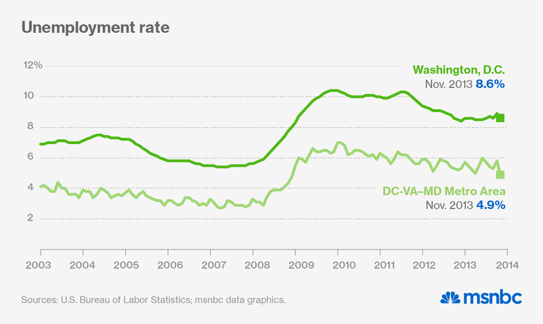 Between 2007 and 2012, 18.5% of D.C.’s residents were in poverty, compared to 8.4% in the entire metro region, which includes six of the 10 richest counties in the U.S. The massive growth in federal contracting dollars—hitting $80 billion in 2010 alone—helped push the median household income to nearly $120,000 in Virginia’s Loudoun County. But the disparities aren’t just in terms of income. While the region’s unemployment rate has dipped to just 4.9%—far below the national rate—it’s stuck at 8.6% in the District. Within the city itself, the differences are even starker: The jobless rate in Ward 8, one of the city’s poorest neighborhoods is 18.6 percent; in Ward 3, it’s 1.8 percent.