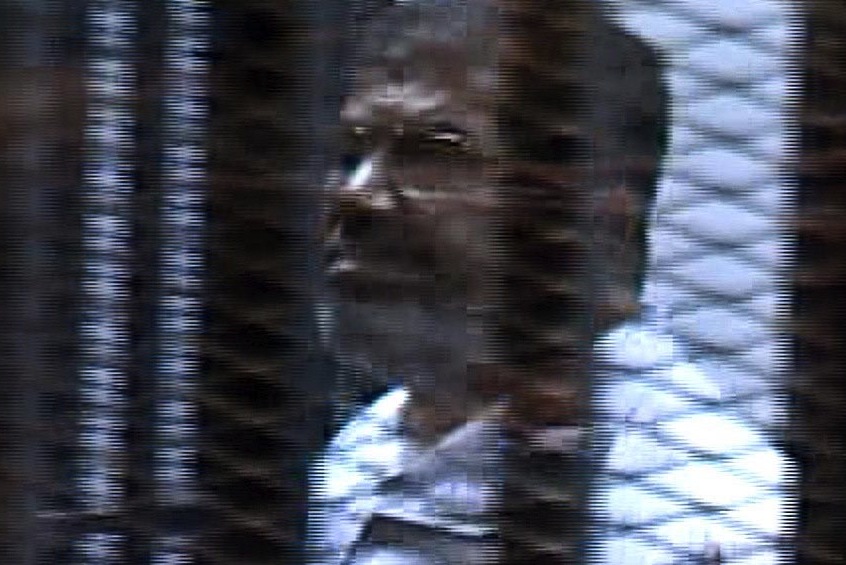 Former Egyptian president Mohamed Morsi is seen inside the glass cage for the first time as the prosecutor began to read out the defendants’ names after Morsi and other defendants arrived at Cairo’s Police Academy to attend the first session of their trial on charges of breaking out of prison during Egypt’s 2011 uprising in Cairo, Egypt, on January 28, 2014. By Pool/Anadolu Agency/Getty Images.