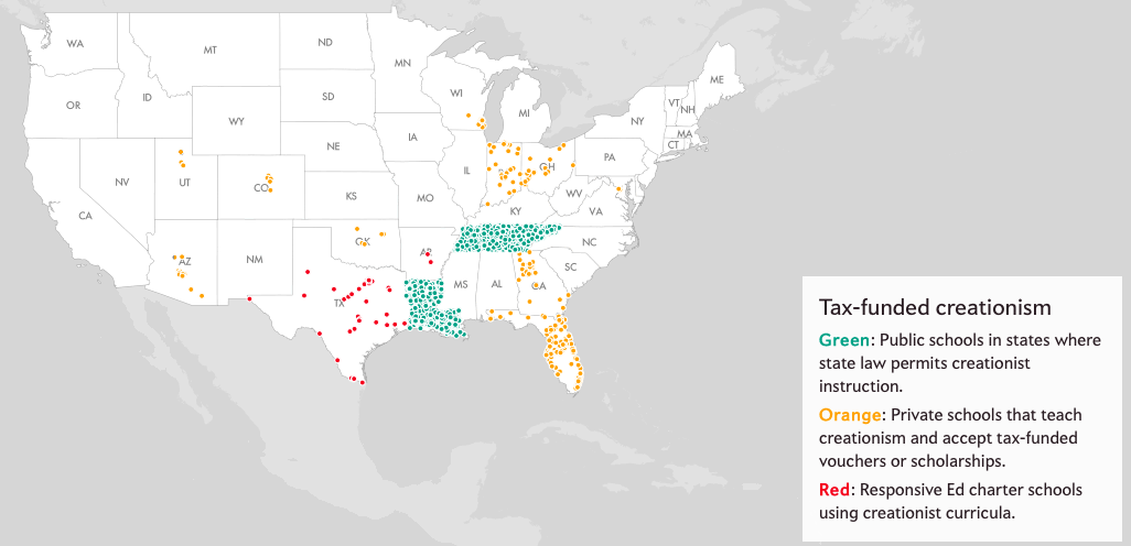 A screenshot of Chris Kirk’s interactive map on where creationism is taught: