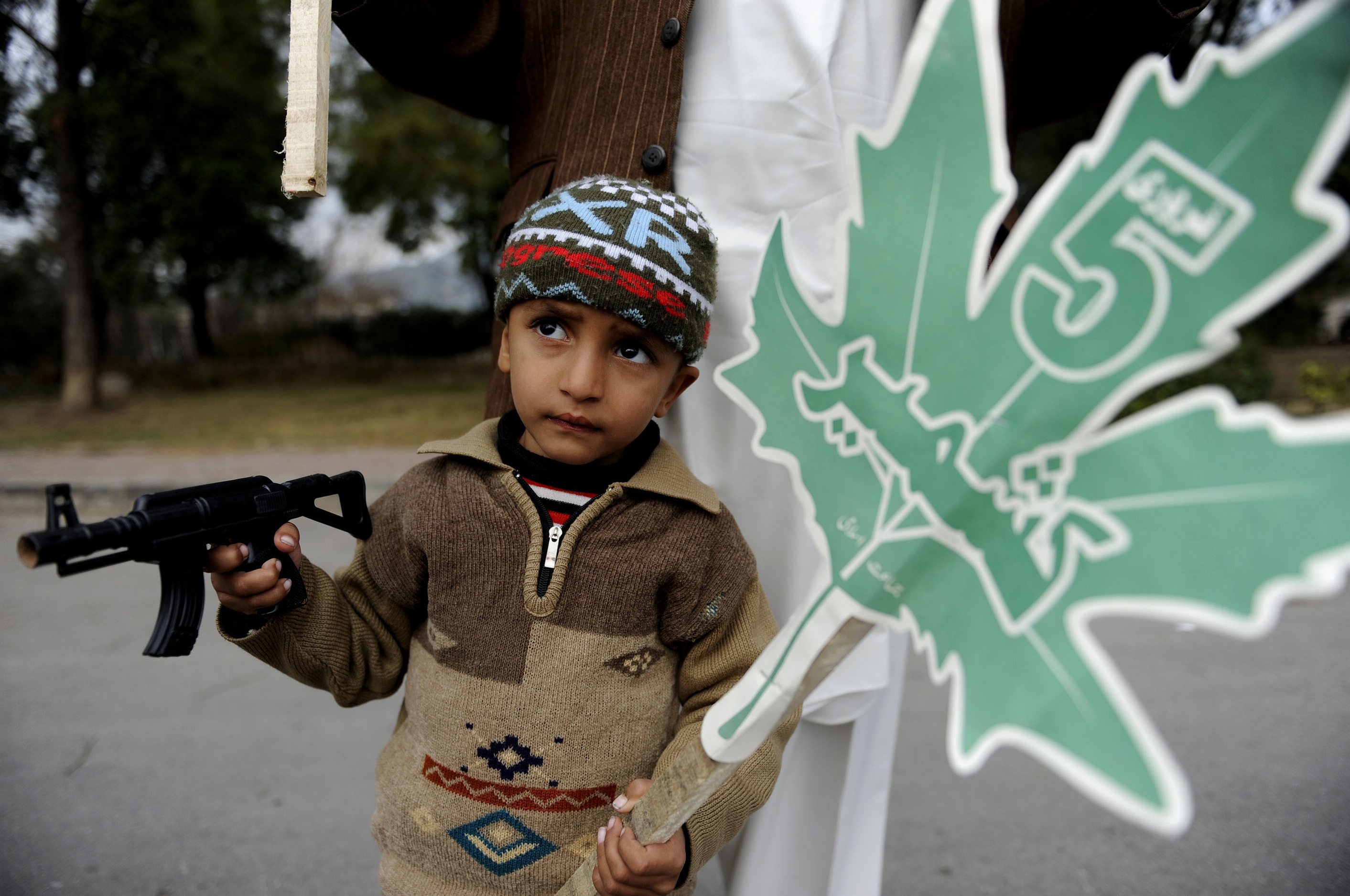 A Pakistani boy holds a banner and a toy gun during the commemoration of Kashmir Solidarity day in Islamabad on February 5, 2014. It is a day dedicated to show Pakistan’s support and unity with the people of Kashmir. By Metin Aktas/Anadolu Agency/Getty Images.