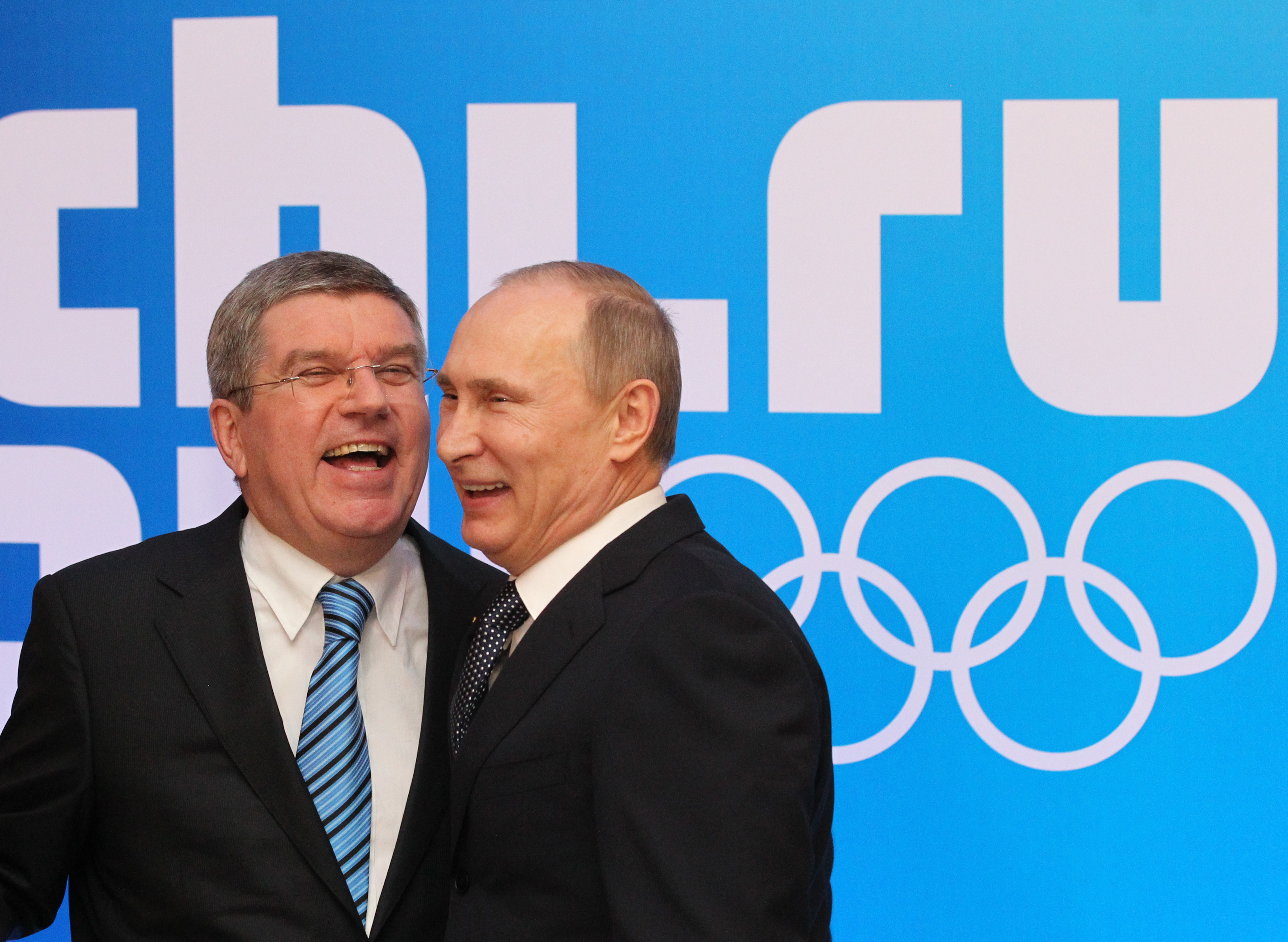 (Photo: International Olympic Committee President Thomas Bach (L) is greeted by Russian President Vladimir Putin at a welcoming event for IOC members ahead of the 2014 Winter Olympics at the Rus Hotel on February 4, 2014 in Sochi, Russia. Putin has arrived in Sochi to participate in the openings of the Winter Olympics. (Photo by Sasha Mordovets/Getty Images)