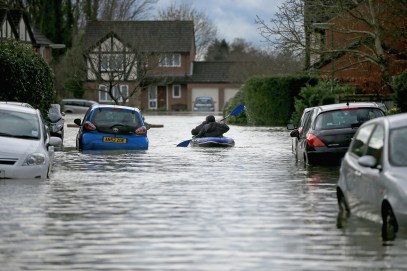CHERTSEY, UNITED KINGDOM – FEBRUARY 11: Residents use a boat make their way through floodwater that has cut off their homes on February 11, 2014 in Chertsey, United Kingdom. The Environment Agency contiues to issue severe flood warnings for a number of areas on the river Thames in the commuter belt west of London. With heavier rains forecast for the coming week people are preparing for for the water levels to rise. (Photo by Christopher Furlong/Getty Images)