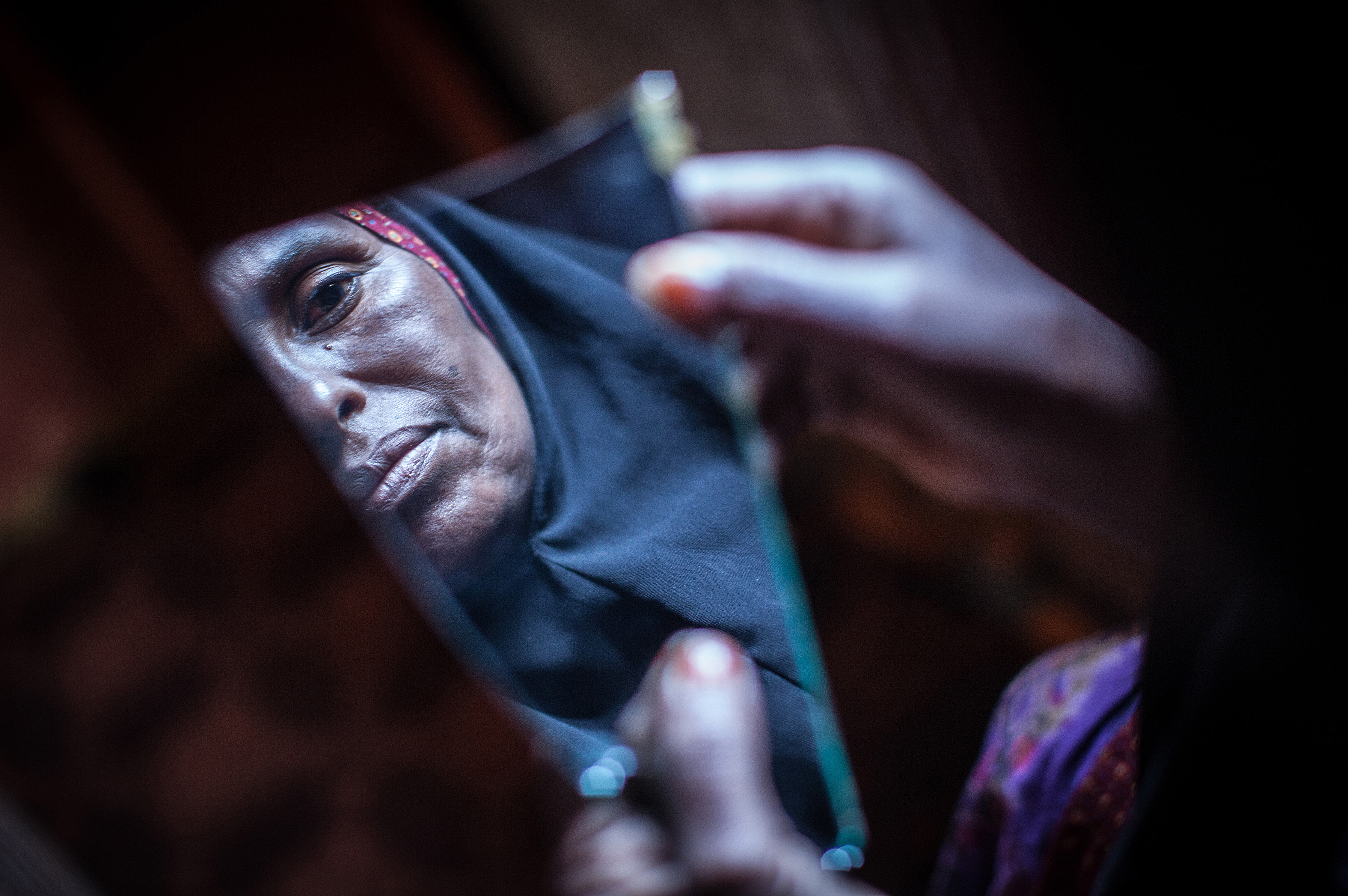Amran Mahamood, who has made a living for 15 years by circumcising young girls, looks into a piece of a mirror in Hargeysa, Somalia. The centuries old tradition of female circumcision, also known as female genital mutilation (FGM), is on the decline in northern Somalia, though it continues to have some of the highest rates of women who have undergone the practice in the world. By Nichole Sobecki/AFP/Getty Images.