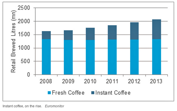 Coffee consumption has steadily increased since 2008 in Colombia, and instant coffee sales have jumped by over 150 percent, the second-largest growth rate in the world, according to Euromonitor. Instant is taking up a larger and larger portion of the local Colombian coffee market.