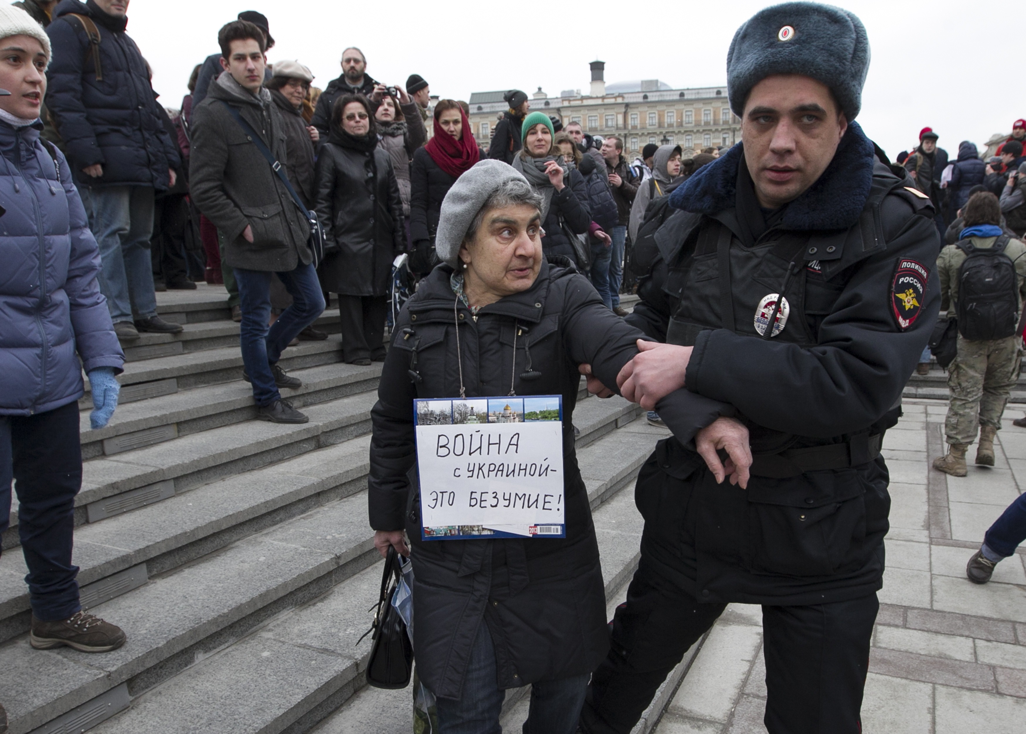 (Photo: An elderly woman wearing a sign that reads “War against Ukraine is madness” is detained by riot police during an unsanctioned anti-war rally close to the Kremlin at Manezhnaya Square on March 2, 2014. Dozens of protesters were detained by police on Sunday during a rally against the military intervention in the Ukraine, after the parliament in Moscow gave President Vladimir Putin approval to use Russian military forces in Ukraine. By Sasha Mordovets/Getty Images.)