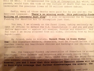 Not much shocks me anymore. I know how the right feels about Obama. They’ve made that clear. So when I received an envelope from my congressman, I almost trashed it like I do all the others. Still, since “no less than Western civilization” was apparently hanging in the balance, I thought I should read it. It’s mostly a fundraising screed filled with the usual apocalyptic Tea Party claptrap. Then, I got to this part of the letter [embedded below]: