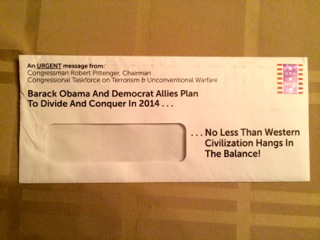As you can read from the envelope, this is a letter from Congressman Robert Pittenger, Chairman of the Congressional Taskforce on Terrorism & Unconventional Warfare. So, if the chairman of this taskforce has found, no doubt after much hard work and research, that our president is the number one enemy of our country (apparently outranking al Qaeda), then isn’t this breaking news? What does he propose should be done to Enemy Number One? (The letter goes on to discuss Obama’s “Islamo-Communist upbringing,” really just icing the cake.)