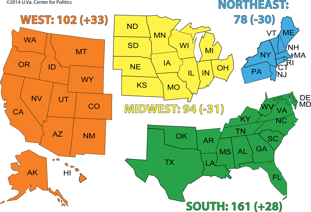 For elections, it would probably mean fewer voters in competitive districts, and less media attention to each individual election. Given the way redistricting works in most states, competitive districts are what’s left after both parties have grabbed the solidly partisan areas. That means there are often are as few competitive districts in California and Texas as there are in states with only a handful of seats. So a bigger House would likely leave us with about the same number of competitive districts as we have now, but with fewer people in each. And with more races to cover and each one a little less important, the resources devoted by the media to individual elections probably would decrease. That’s good news for incumbents, but bad news for competition and democracy.