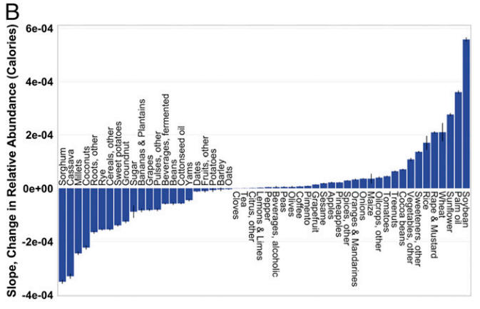 Nutrtionally speaking, much more important are the rise in the big staple cereals – wheat, rice, and corn (maize). Consumption of the first two is driven by increasing affluence in East and South Asia, where both wheat and rice have been grown for thousands of years. Again, no evidence of Americanization. Corn actually is American – I guess you have to give them that one. But overall the graph they produce shows the opposite of what they allege.