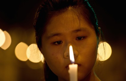 A Malaysian mourner holds a candle during a vigil for missing Malaysia Airlines passengers at the Independence Square in Kuala Lumpur on March 10, 2014. Malaysia has expanded its search area for a missing jet after three days of scouring the sea failed to bring forth any confirmed sightings of wreckage, an official said. He added that besides searching in waters between Malaysia and Vietnam, authorities were also searching on land in Malaysia and off western Malaysia. AFP PHOTO/ MANAN VATSYAYANA (Photo credit should read MANAN VATSYAYANA/AFP/Getty Images)