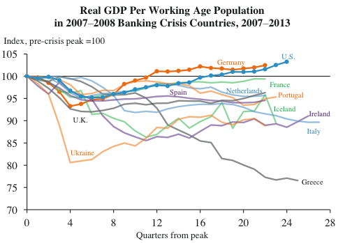 I’ll restrict myself to core facts that are not in dispute, rather than the arguments in the report. Take the economy. Despite unprecedented austerity at the state and local government level, it’s now clear that the US has recovered from the Great Recession better than any other economy: