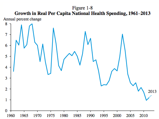 The deficit has come down at a rapid pace, without tipping us back into recession. And a key indicator of future debt – the cost of healthcare – is looking much better than it once did (although the causes for it remain disputed):