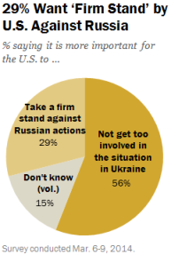 The new national survey by the Pew Research Center, conducted March 6-9, 2014 among 1,003 adults, find more disapprove (44%) than approve (30%) of the way the Obama administration is handling the situation involving Russia and Ukraine, while roughly a quarter (26%) offer no opinion. … Those who are following the news very closely are more inclined than others to advocate for the U.S. to take a firm stand against Russia. Among those closely following the news, roughly as many say the U.S. should take a firm stand (47%) as prefer not getting too involved (43%).