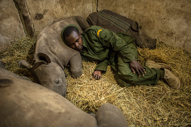 Yusuf, a keeper, sleeps with three orphaned baby rhinos at the Lewa Wildlife Conservancy in northern Kenya. The youngest rhino on the right was orphaned when poachers killed his mother on Ol Pejeta Conservancy. The largest rhino, Nicky, is not an orphan but is being hand-raised because her mother is partially blind. On the woman who took the photo:
