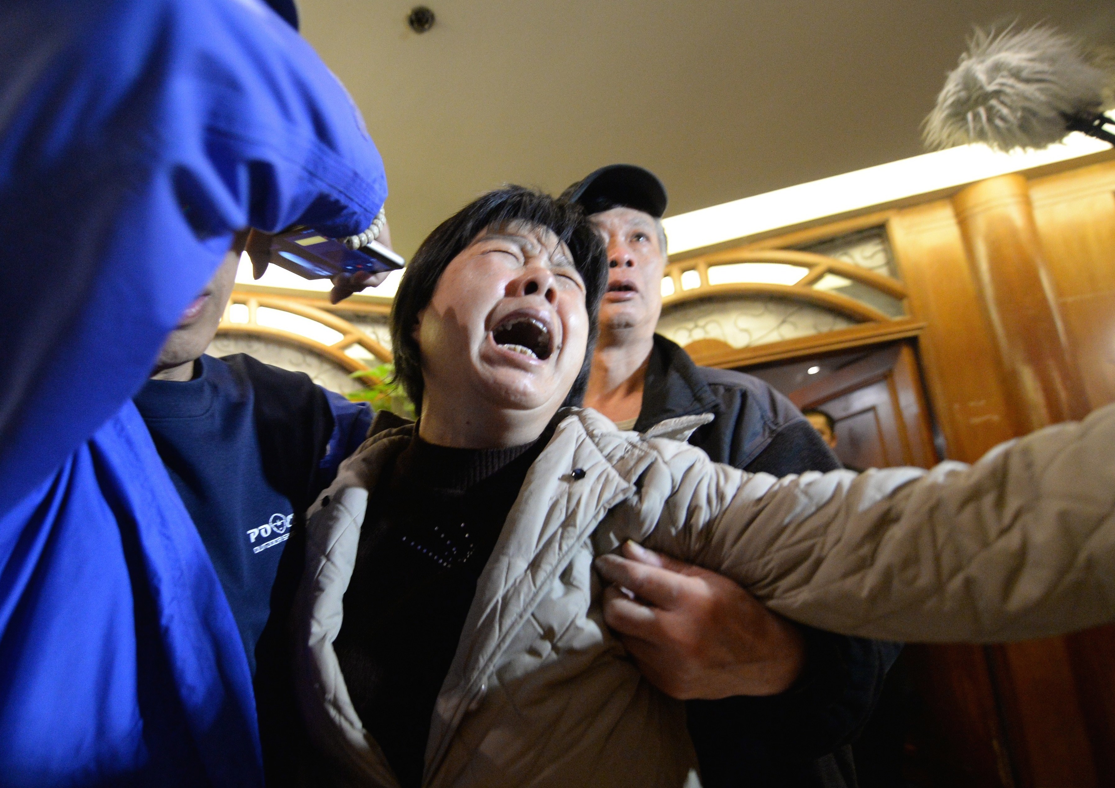 A relative of passengers on Malaysia Airlines flight MH370 cries at a hotel in Beijing on March 24, 2014 after hearing the news that the plane plunged into the Indian Ocean. Prime Minister Najib Razak made the announcement today as the airline reportedly told relatives that none on board survived. By Goh Chai Hin/AFP/Getty Images.