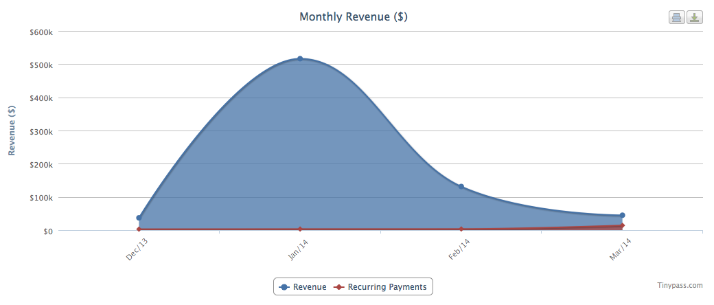 Today, we have 28,100 subscribers, and have had revenue of $694K since January 1. Traffic was down from a record February, at 826,000 unique visitors, but higher than six previous months this past year. Revenue this March was $45K, compared with March 2013 which brought us $38K. Revenue for the first quarter of 2014 was 105 percent of last year. We’re growing, but slowly and surely. And with your help, we’ve been able to avoid the ethically perilous world of sponsored content, and do all of this even without ads for subscribers.