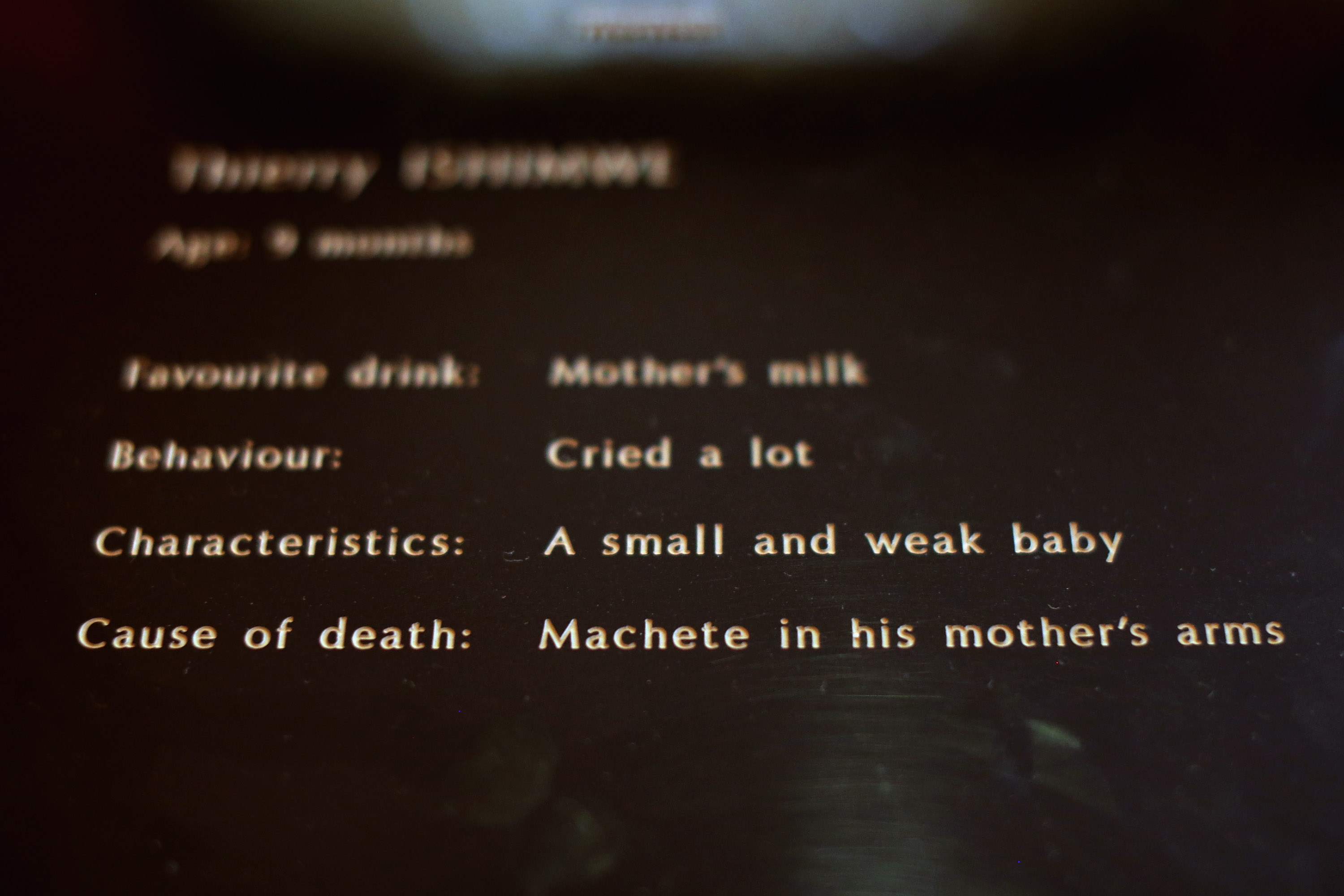 (Photo: The fate of 9-month-old genocide victim Thierry Ishiwme is displayed at the Kigali Genocide Memorial Centre in Kigali, Rwanda on April 5, 2014. Rwanda is commemorating the 20th anniversary of the country’s 1994 genocide, when more than 800,000 ethnic Tutsi and moderate Hutus were slaughtered over a 100 day period. By Chip Somodevilla/Getty Images)