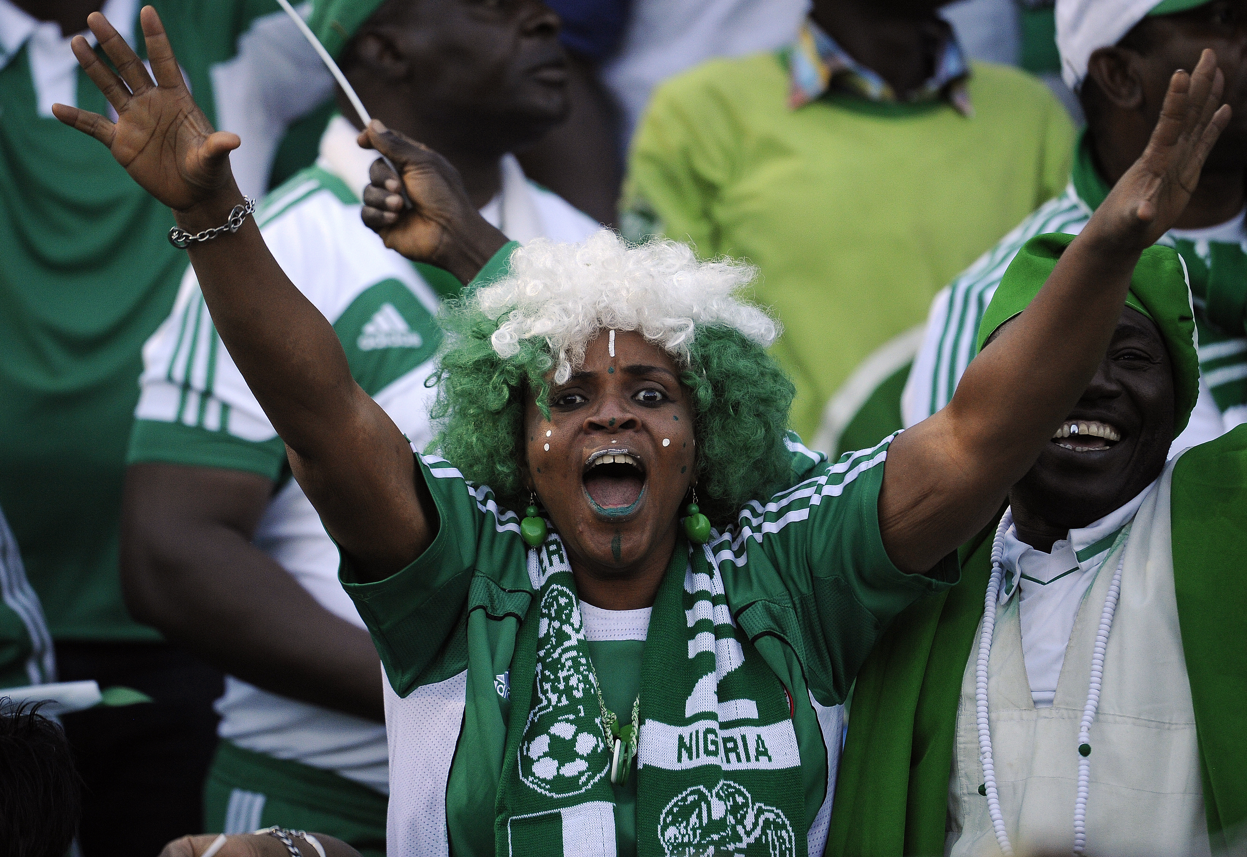 (Photo: A Nigerian fan celebrates her team’s victory over Ethiopia after a 2014 World Cup qualifying match in Addis Ababa on on October 13, 2013. By Simon Maina/AFP/Getty Images)