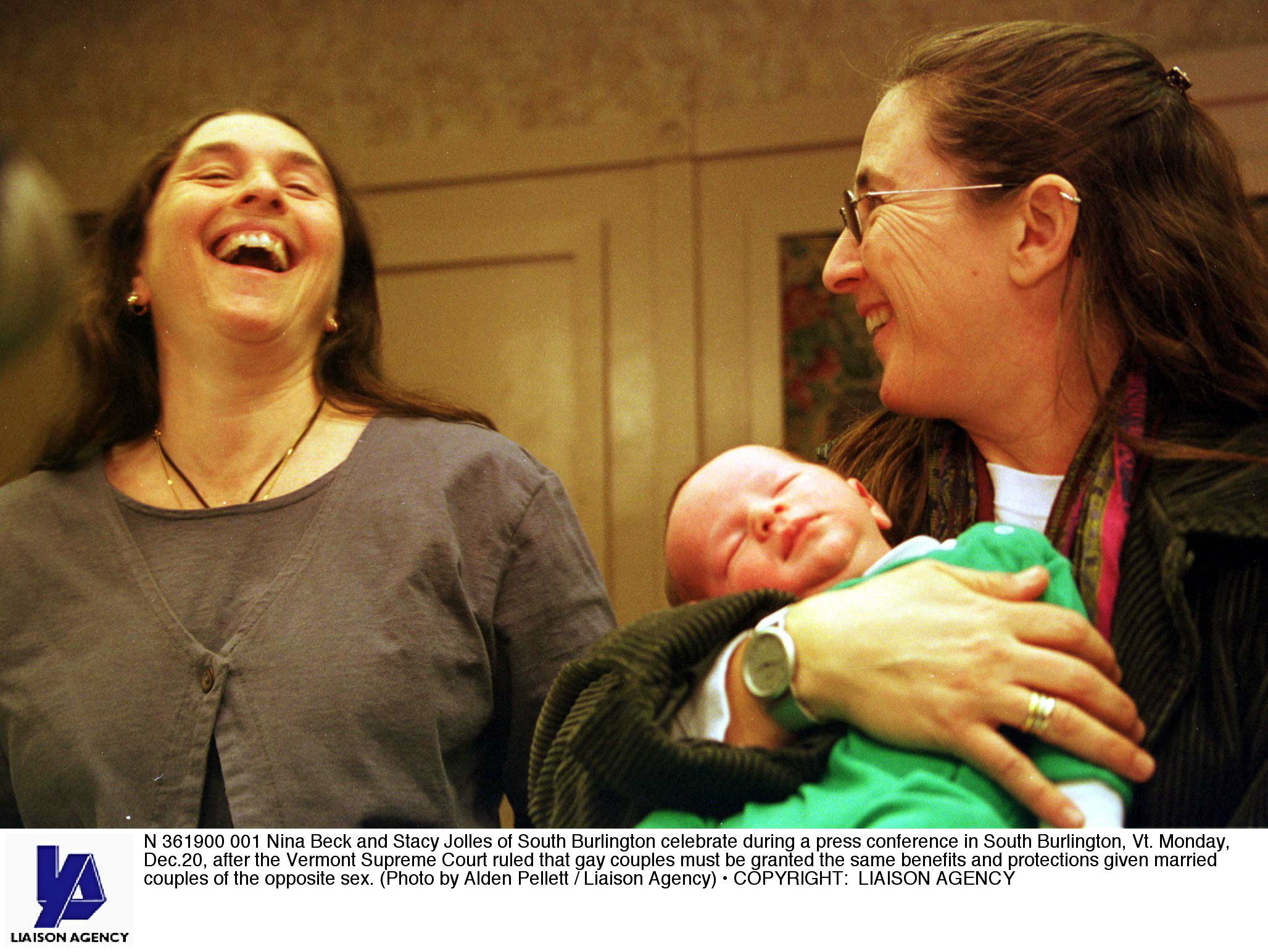 (Photos: Nina Beck and Stacy Jolles of South Burlington celebrate during a press conference in South Burlington, Vt. Monday, Dec.20, 1997, after the Vermont Supreme Court ruled that gay couples must be granted the same benefits and protections given married couples of the opposite sex. By Alden Pellett/Liaison Agency/via Getty.