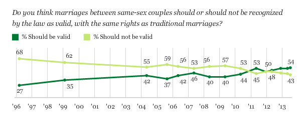 Look first of all at the polling on the question. No one can doubt that the actions of a handful of people in the highest regions of the Obama administration would never have happened without this long-sustained, widening and deepening support in the polls. Public persuasion and advocacy were absolutely indispensable to bringing the new majority about, and making cautious politicians capable of changing. So check out Gallup’s polling on the question over the last couple of decades: