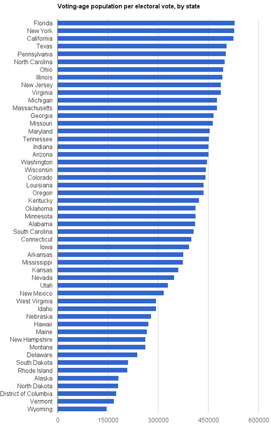 It turns out that many states have huge populations of people who are ineligible to vote. California and Texas, for example, have 5.1 million and 2.6 million non-citizens, respectively, which cuts down their voting-eligible populations significantly. Florida, meanwhile, has slashed its voting population by over 10 percent through the disenfranchisement of felons. (Ironically, this makes its position in the Electoral College look “fairer,” since by raw population the Sunshine State comes out the worst.)