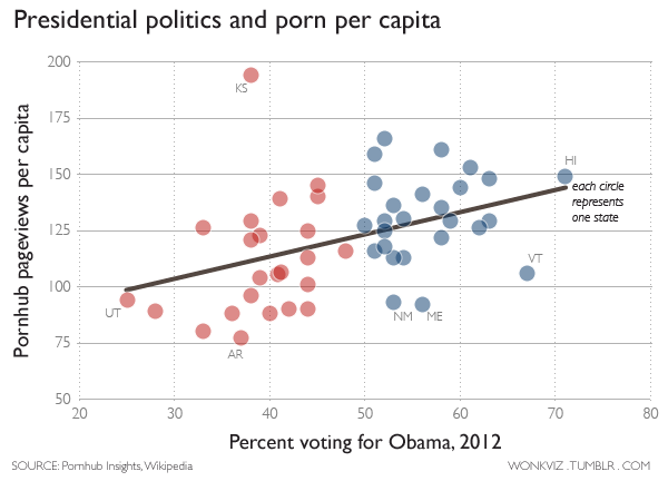 Plotting Obama vote share in 2012 versus porn consumption, it looks like blue states consume more porn per capita than red ones. Aside from Kansas – a clear outlier – and Georgia, the remaining top ten per-capita porn consumers are all blue. Similarly, New Mexico and Maine are the only blue states in the bottom ten per-capita porn consumers.