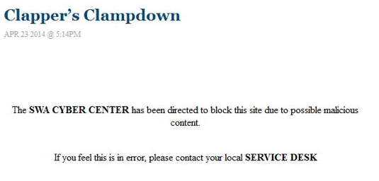 I’m a US Army soldier on deployment to Kuwait and read your blog daily. Like other government computer networks, the one here blocks certain content. This screen capture, from the article about the gag order imposed by James Clapper on the intel community, is too ironic not to share.