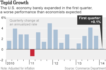 [R]eal GDP grew only 0.1% in the first quarter of the year, according to this morning’s report from the Commerce Dept. That’s a huge deceleration from last quarter’s 2.6%, and well below analysts expectations of around 1.2%.