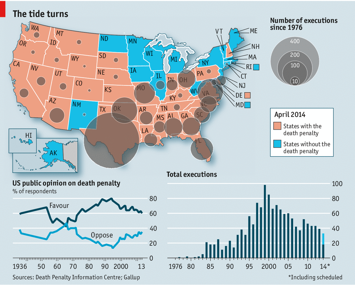 The Economist‘s chart fails to note that many of the states listed as still having the death penalty have actually instituted moratoria. Those states include: California, Colorado, North Carolina, Arkansas, Oregon, Kentucky and Washington.
