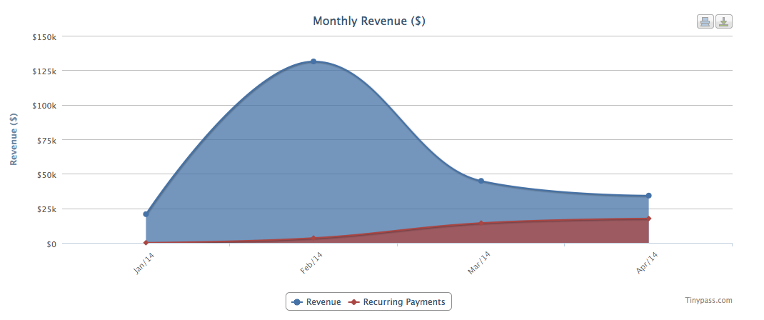 The big hump is the second wave of newly subscribed Dishheads, renewing after one year. The red line is for recurring payments, either monthly or annually, and April’s total intake was a little over $34,000. Over time, the red proportion should grow and grow. As for traffic, well over a million individual people read something on the Dish in April, our third best month in the past year. The two most popular posts in April were “The Hounding Of A Heretic” and “Jo Becker’s Troubling Travesty Of Gay History.”