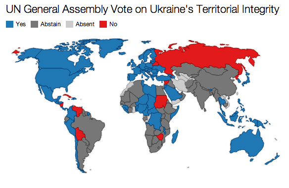 Four of the five BRICS countries—Brazil, India, China, and South Africa—chose to not take a side on the resolution, as did many African, South American, and Asian countries. Some observers argue that the abstentions show a wariness among developing nations to choose sides in a confrontation between Russia and the West. “India and China have deep reservations on sovereignty and territorial integrity and in the past have not hesitated to slam US for Libya, Syria etc.,” wrote The Times of India after the vote. “With Russia doing exactly the same thing, the dilemma in the developing world is acute.” Other countries avoided participating in the vote altogether, including Iran, one of Russia’s closest allies, and Israel, one of America’s.