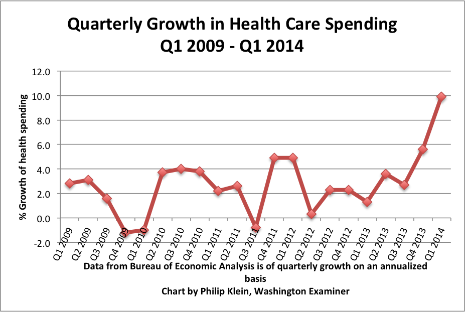 But the 9.9 percent jump (on an annualized basis) came in the quarter from January through March, which was the first three months in which individuals who gaining coverage through the law were able to use it. That was the fastest rate recorded since health care spending grew at a 10 percent rate in the third quarter of 1980.