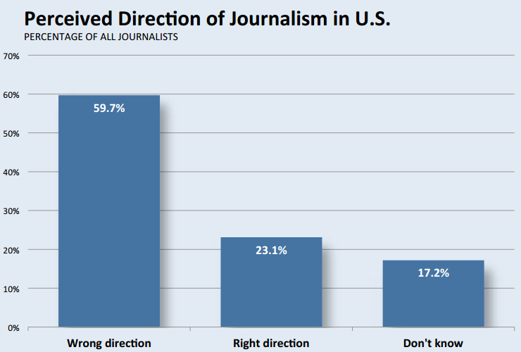 Among the more negative findings are that U.S. journalists today are less satisfied with their work, less likely to say they have complete autonomy to select stories, much more likely to say that journalism is headed in the wrong direction than in the right one, and much more likely to say that their news staffs have shrunk in the past year rather than remained the same or grown.