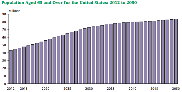 Today, one in seven Americans is over 65. In 15 years, one in five Americans will be over 65. The gray boom is inevitable and it’s happening for two simple reasons. The first reason is that all Americans are living longer (except, for mysterious reasons, poor women). The second reason is that every living member of the baby boomer generation, the largest adult generation in U.S. history (there are actually more Millennials, born between the early 1980s and late 1990s), will be older than 65 in the year 2030. Here, from a new Census report, is a look at the steady growth of 65+ Americans—a population that will double in the next four decades.