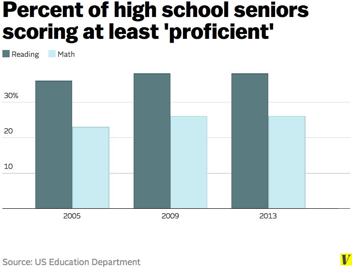 Just 26 percent of 12th-grade students scored as proficient or better in mathematics in 2013. In reading, 38 percent were proficient or better. And there has been no improvement in 12th-graders’ scores since 2009, the last time students took the tests. … Scores released in December showed that fourth-grade and eighth-grade students have slowly improved their performance in reading and math, even though less than half of them score as proficient in those subjects. But Wednesday’s data show high school seniors haven’t even made incremental progress.