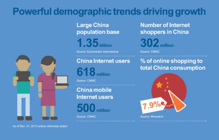 The really exciting thing for Alibaba is that China is still a market where the majority of people don’t even have internet access yet (just 42 percent had it at the end of 2013 compared to 81 percent in the U.S.). China is still rapidly industrializing, and millions of people are still moving from the countryside into the cities, providing a huge amount of room for Alibaba to grow in China.